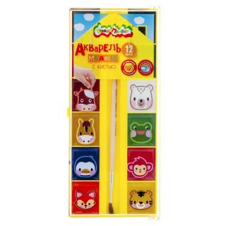 Акварель 12 цветов с кистью в ярком жёлтом пенале в эксклюзивном цвете Каляка-Маляка! Каждая кювета украшена своим персонажем, чтобы ребенок мог запоминать цвета.