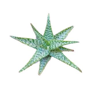 У этого Алоэ короткий стебель, из которого растут утолщенные листья, длиной до 25 см с колючками по краям. Розетки плоские, их диаметр может достигать 10 см. Окрас листьев серо-зеленый с темными зелеными вкраплениями. Такое растение будет эффектно смотреться на любом подоконнике.