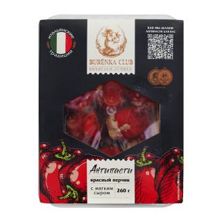 Антипасти - группа итальянских закусок, которые традиционно подают перед основным блюдом. Само слово ""Atipasti"" происходит от итальянского, где: «anti» – «до» и «pasta» – «еда». Красный мини перчик сорта Кардоула BURЁNKA CLUB отличается оригинальной формой колокольчика, имеет сочную мякоть, яркий вкус и приятную умеренную остроту.В качестве начинки мы используем сливочный сыр, приготовленный по классической рецептуре, имеющий жирность 65% и нежный сливочный вкус