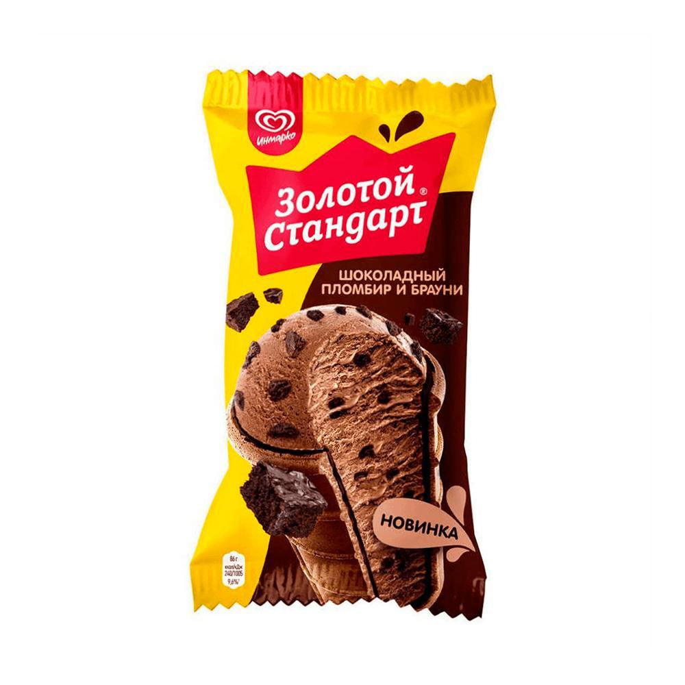 Мороженое ЗОЛОТОЙ СТАНДАРТ Пломбир шоколадный с бисквитом брауни – это 100% натуральный шоколадный пломбир в хрустящем вафельном стаканчике. Его вкус стал намного интереснее за счет добавления новых текстур – кусочков брауни и хрустящей глазури. Густая кремовая консистенция пломбира способствует тому, что мороженое медленно тает во рту, приятно освежает и оставляет яркое послевкусие шоколада.