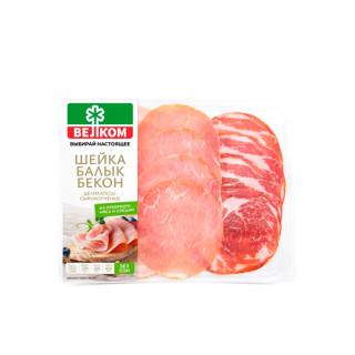 Ассорти сырокопченое ВЕЛКОМ Шейка, балык, бекон – прекрасный вариант для тех, кто не может определиться или любит разнообразие. Лучшие вкусы в одной упаковке, чтобы вы могли быстро и вкусно собрать мясную тарелку к любому событию. В сервировочной нарезке сырокопченых деликатесов представлены классические продукты: шейка, балык и бекон. Оптимально подходит для сервировки праздничного стола в качестве самостоятельной закуски, а также для приготовления бутербродов и сэндвичей.