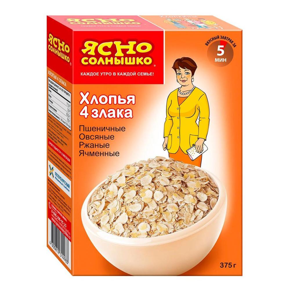 Хлопья 4 злака "Ясно Солнышко" приготовлены из четырёх наиболее ценных зерновых культур: пшеницы, овса, ржи и ячменя.