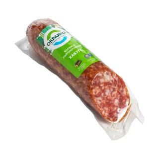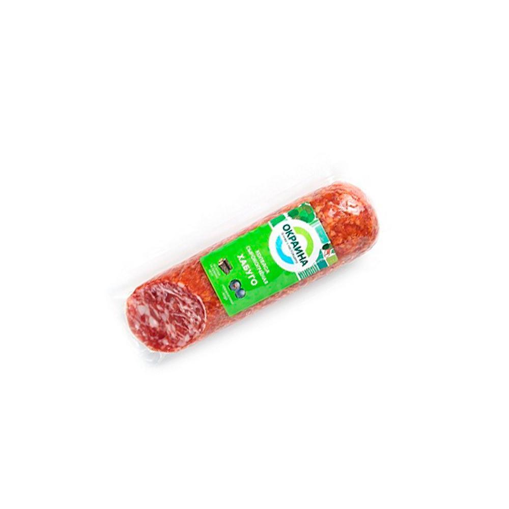 В составе сырокопченой колбасы Хабуго охлажденная свинина и ароматные специи: тмин в гармонии с мясом создают аромат, можжевеловая ягода подчеркивает всю полноту вкусовых ощущений, как будто колбаса приготовлена из только что добытого на охоте мяса. Хабуго щедро коптится на буковой щепе и сушится длительное время, в результате чего колбаса насыщается вкусом настоящего сыровяленого мяса.