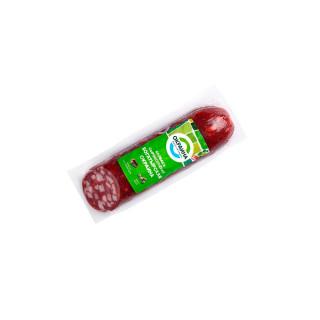 Салями Богатырская Окраина изготавливается из филе куриной грудки и рубленного мяса свинины. На срезе колбаса имеет красивый рисунок с крупными кусочками шпика.