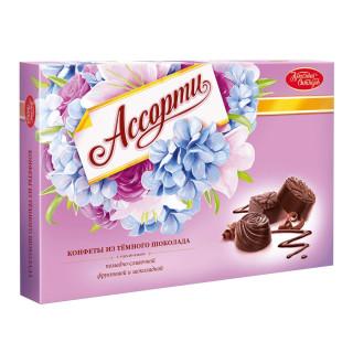 Набор конфет из тёмного шоколада в красочно оформленной упаковке — лакомство с помадно-сливочной, фруктовой и шоколадной начинками.