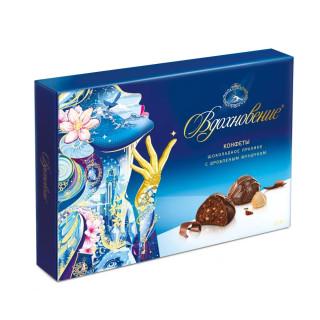 Конфеты в коробке «Вдохновение» – коренастые полукруглые конфеты из шоколадно-орехового пралине, в котором рассыпались осколки дробленого фундука. Плотная, чуть рассыпчатая текстура, узорная темная глазурь. Насыщенный аромат шоколада и богатый вкус какао и орехов – замечательный подарок для настоящих ценителей шоколадных конфет.