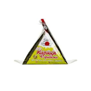 Закуски японской кухни Онигири Курица с грибами от торговой марки ФУДЖИ – готовое блюдо, которое готовится из отборных ингредиентов с добавлением шампиньонов, морской капусты и кунжута.