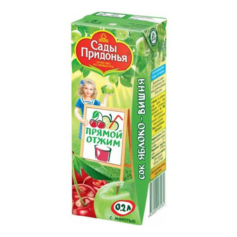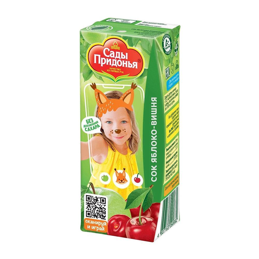 Сок произведен из зелёных яблок и вишни, выращенных в собственных садах компании «Сады Придонья». Детям понравится яркий вишнёвый вкус и аромат, а также насыщенный цвет сока. Вишня обладает антиоксидантными и восстановительными свойствами. Особенно полезно пить такой сок после тренировки или физической нагрузки, для восстановления мышц.