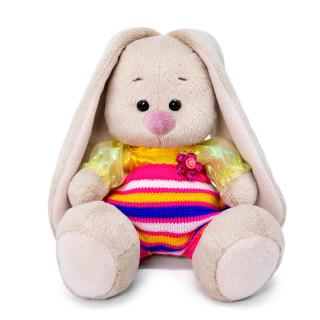 Зайка в забавном комплекте: вязаные штанишки из акрила в яркую полоску и нарядная блузочка из медового сатина с рукавом‑фонарик из ткани лимонного цвета с отливом.